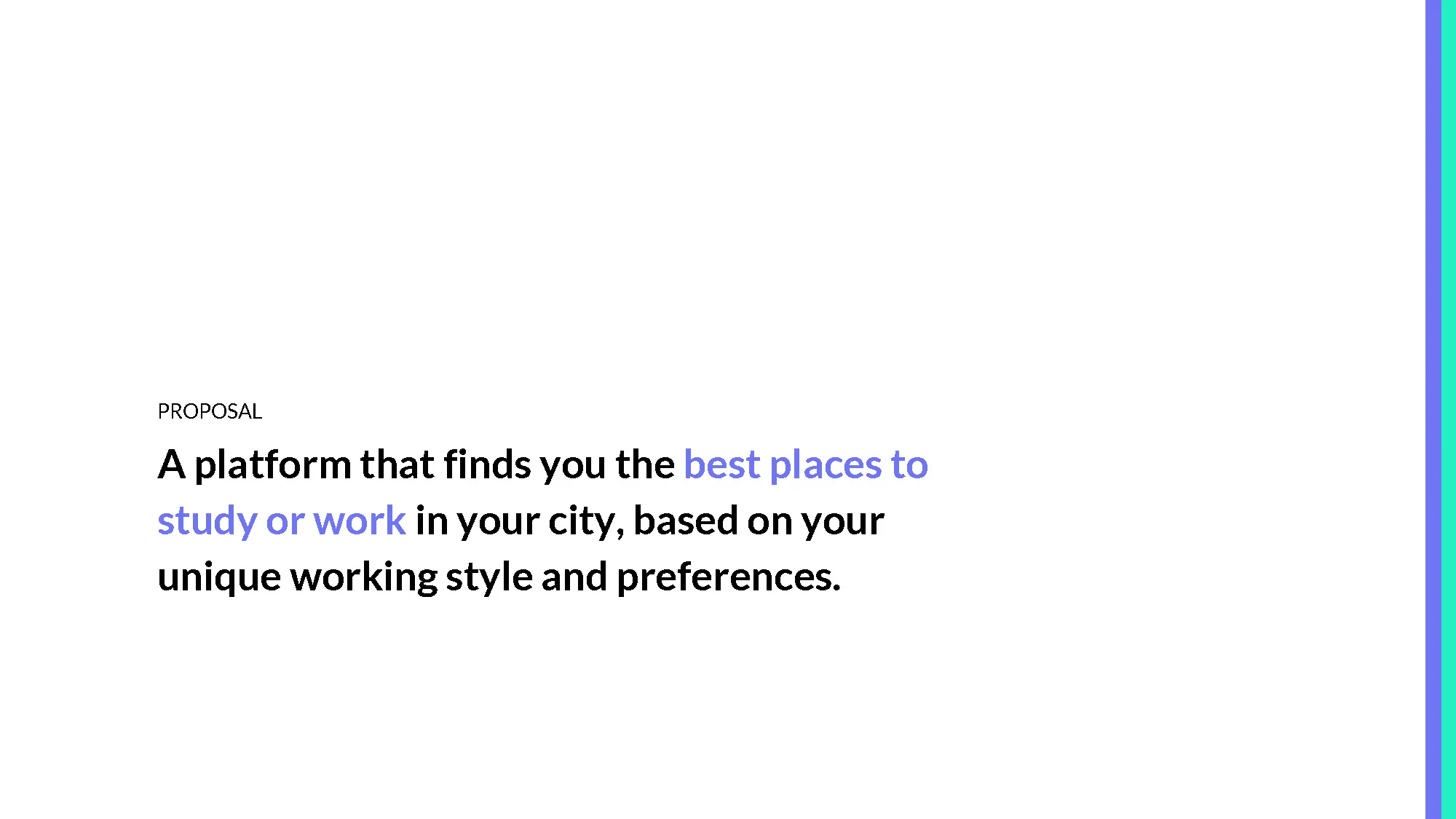 It can be hard to find the perfect place to get work done. There are endless options for different places to work but there’s no easy way to tell if any given place will work for you. Work Well is a platform that finds you the best places to study or work in your city, based on your unique working style and preferences. (Includes promotional video, poster and presentation)